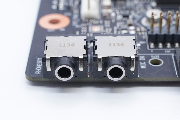 在IO接口层面,从上到下分别是耳麦一体接口、麦克风接口。