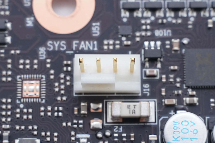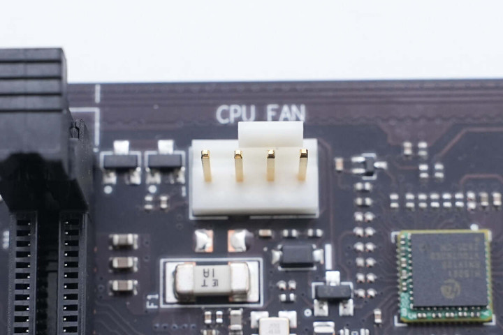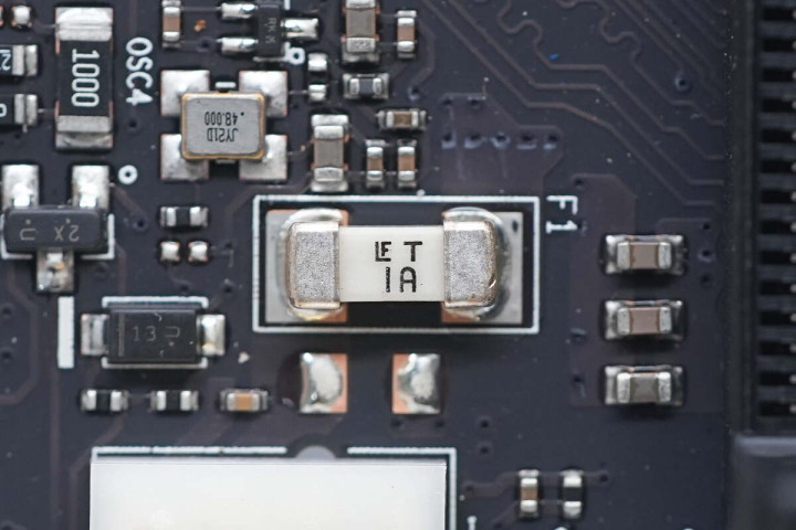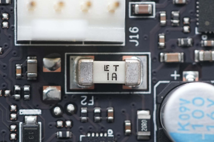 主板右下角还有另一个机箱风扇接口,一旁有力特保险丝,熔断电流1A。