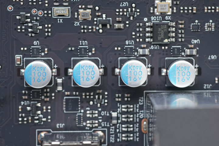 4颗贵弥功16V 100μF贴片固态电容位于USB2.0 IO接口以及RJ45网线IO接口右侧。