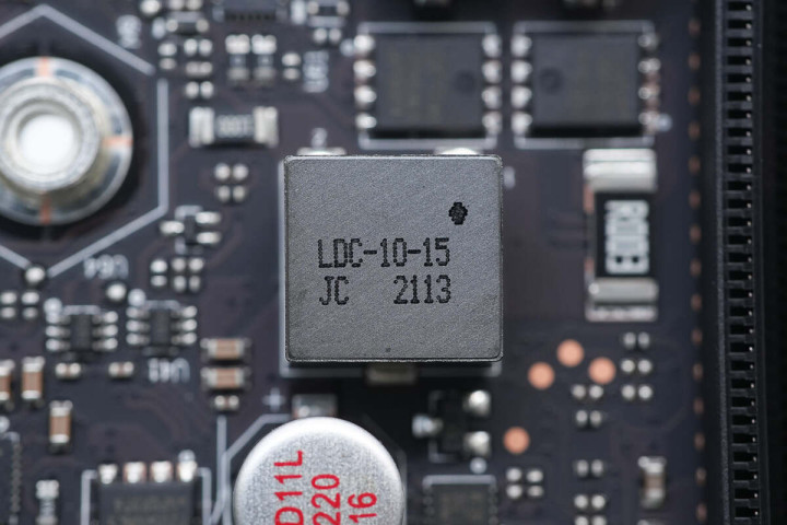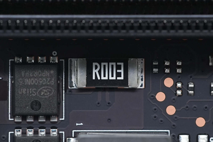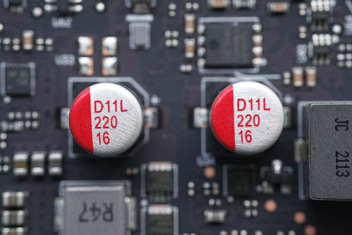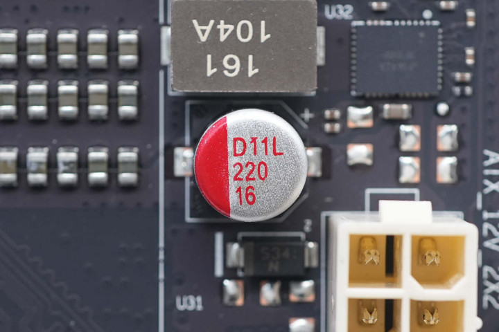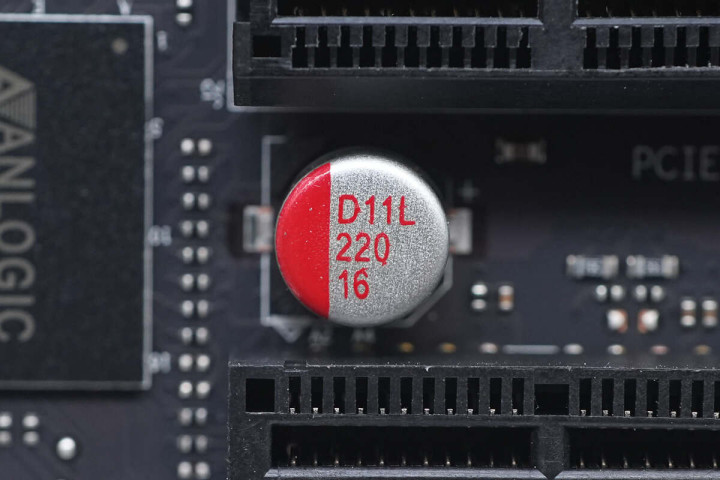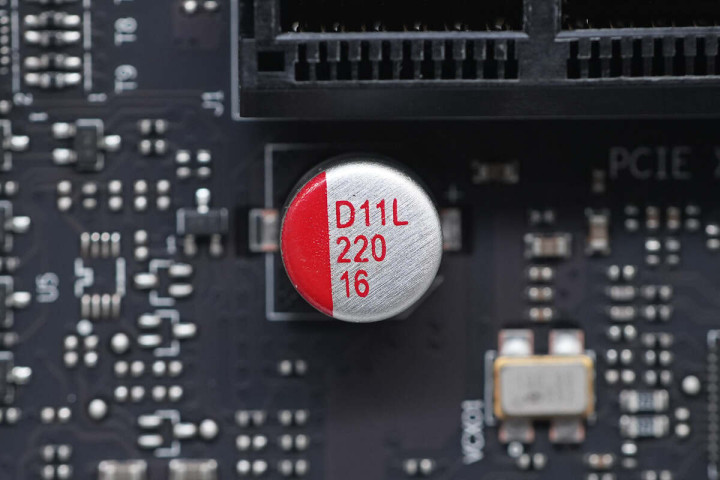 PCIE3.0×16插槽1下有一颗16V 220μF贴片固态电容。