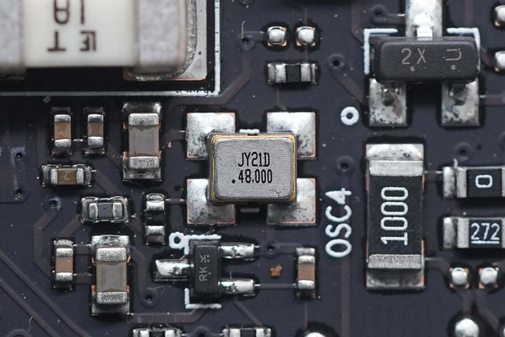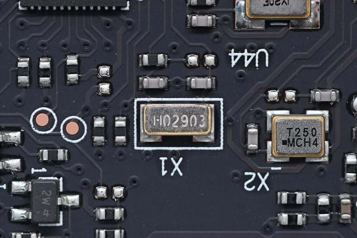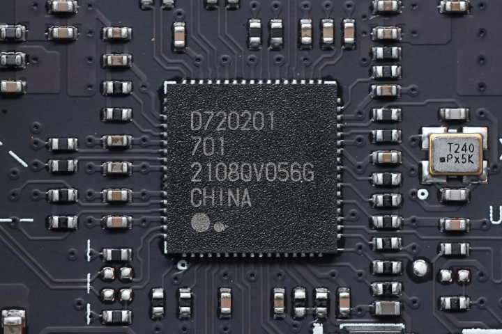 MSATA接口右侧有一颗USB3.0串行总线控制器,型号为μPD720202,来自Renesas瑞萨。芯片一旁还有一颗丝印T240无源晶振。