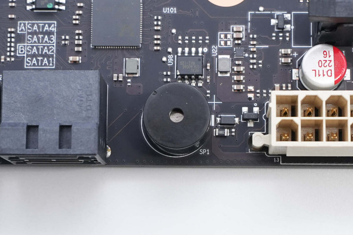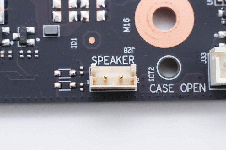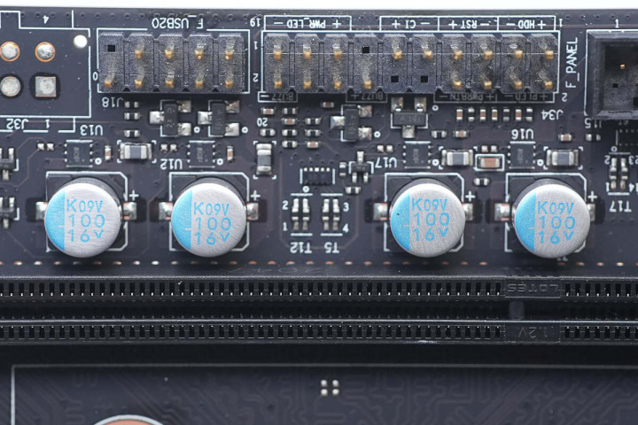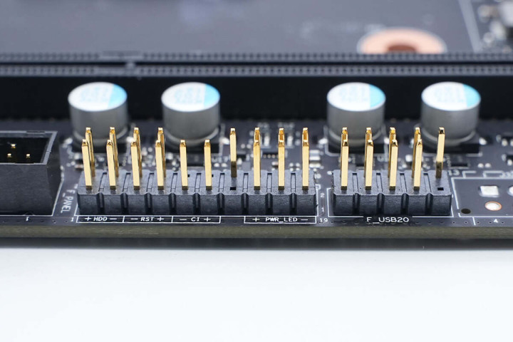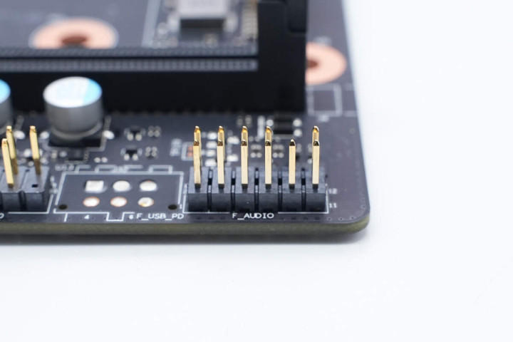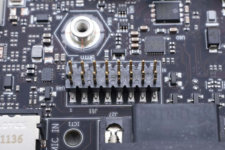视角转向主板右上角,从上至下展示,右上角有机箱前面板音频接针,一旁USB接针为空焊盘。