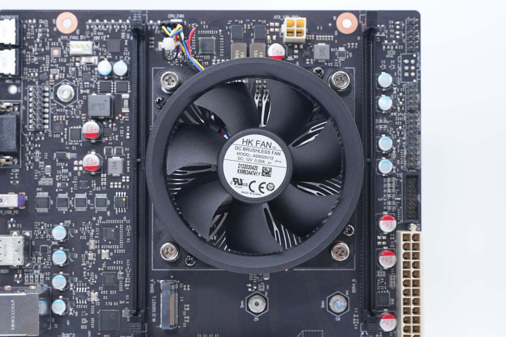 主板CPU散热采用一款来自航嘉的下压式挤压铝散热风扇,直径9CM,型号为AS8025V12,采用12V 4PIN供电,支持调速。