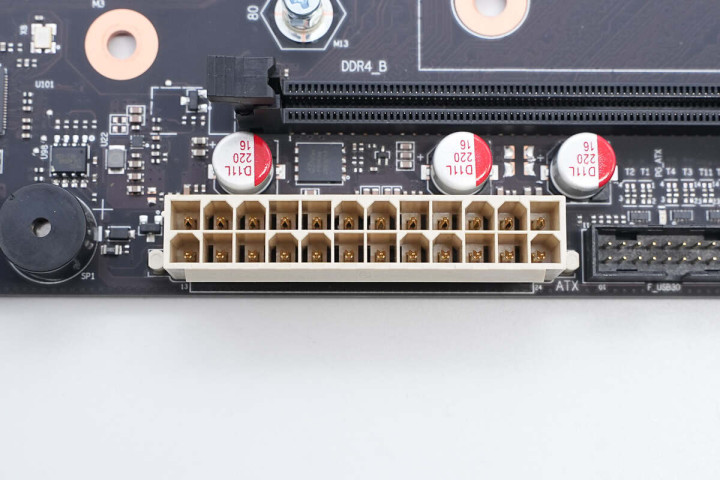 24PIN主板供电接口,兼容传统ATX电源,上有三颗16V 220μF贴片滤波电容。