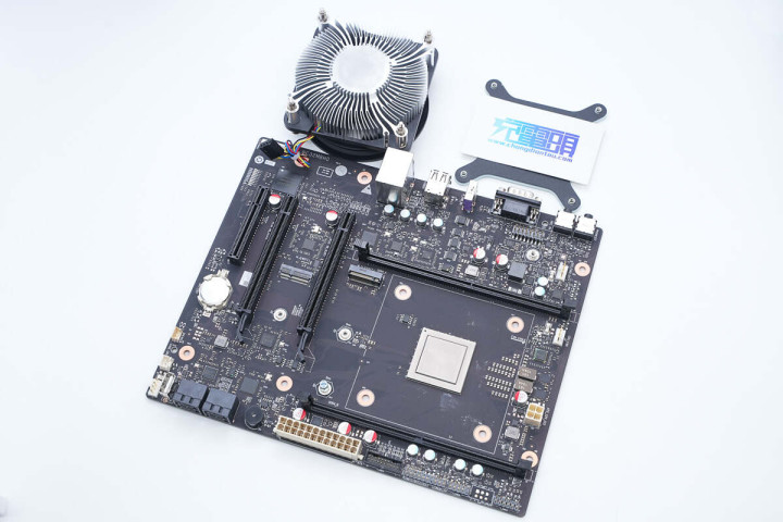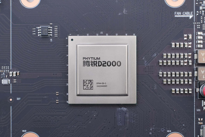去除风扇,可见腾锐D2000 CPU本体,其采用BGA焊接,并无x86 ATX主板的CPU插槽结构。