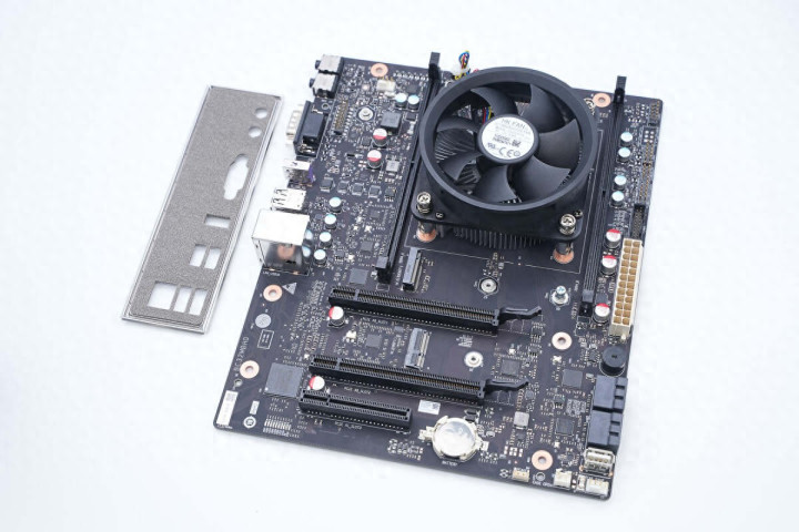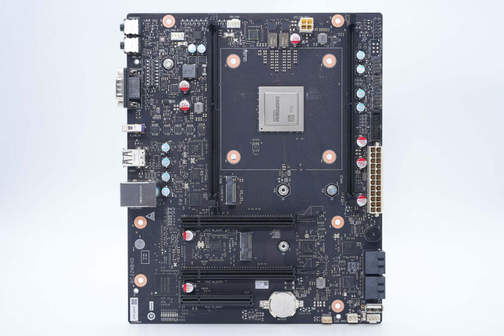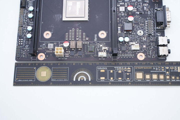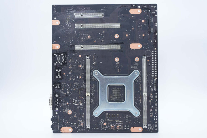 看过IO接口分布,再看主板背面。整体焊点清晰、排布整齐,CPU背面有一块散热背板,用于为散热器提供足够下压力,并分散主板应力,避免变形。