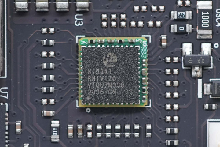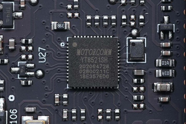 视角继续向下,可见一颗千兆以太网芯片,来自MotorComm裕太微,型号YT8521SH。