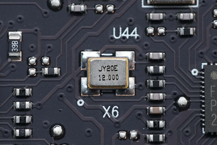 向下有一颗MXIC旺宏NOR Flash,型号为MX25L4006E,容量512Kb,一旁有12MHz晶振。