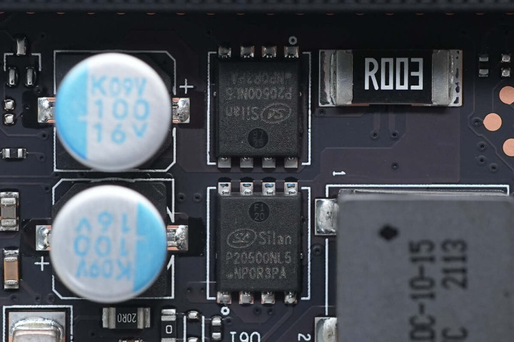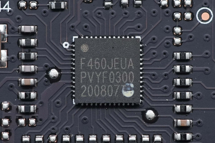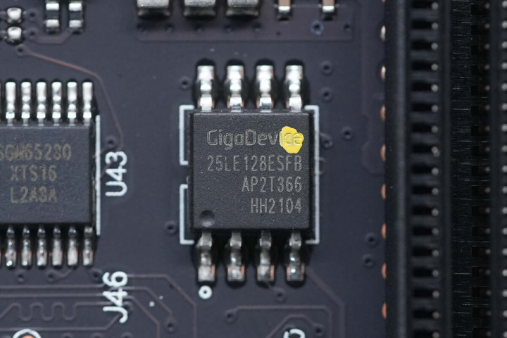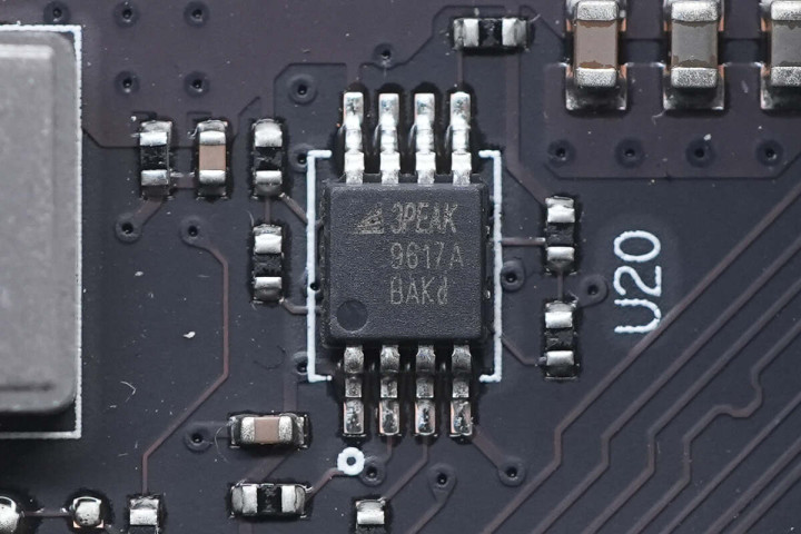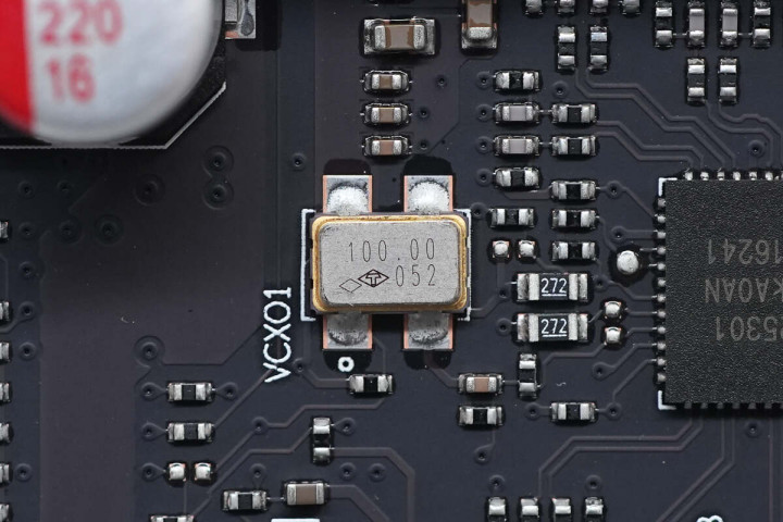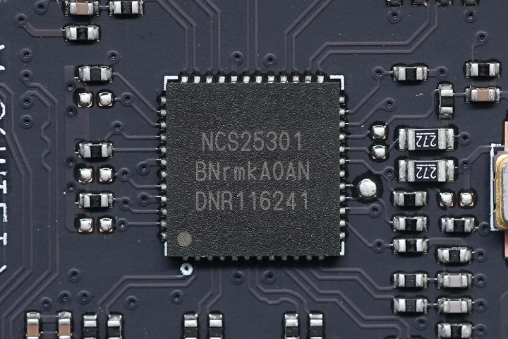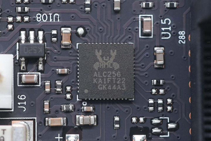 内存插槽A左侧有一款瑞昱音频编解码芯片,型号ALC256,支持16/20/24-bit音频输出,采样率可达192kHz。