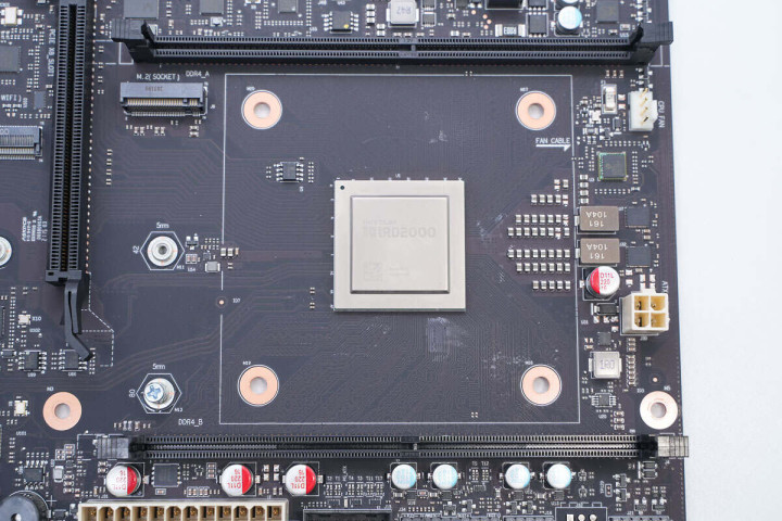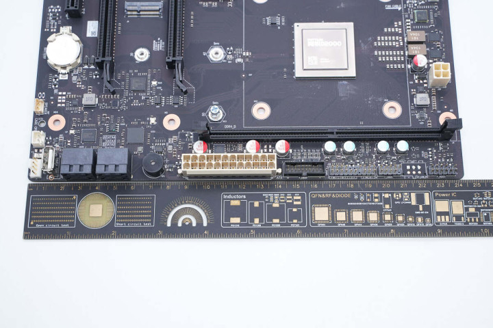 镜头拉近,可见CPU两侧各分布一条DDR4内存插槽A和内存插槽B,下侧设有M.2 2280插槽,兼容2242尺寸固态硬盘。