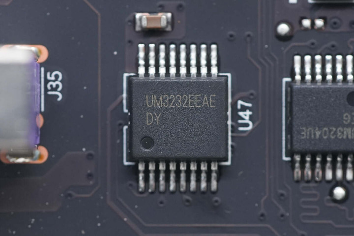 视角继续下移,USB3.2接口右侧有一颗RS232收发器芯片,来自Union-IC英联,型号为UM3232E。
