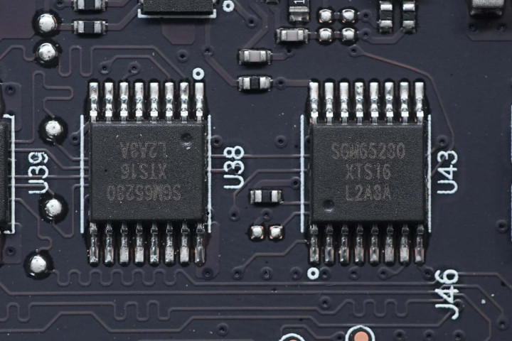 两颗SGMICRO圣邦微SGM65230,该芯片为是一款4bit 1:2多路复用器/多路分解器以及高带宽总线开关。