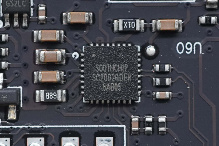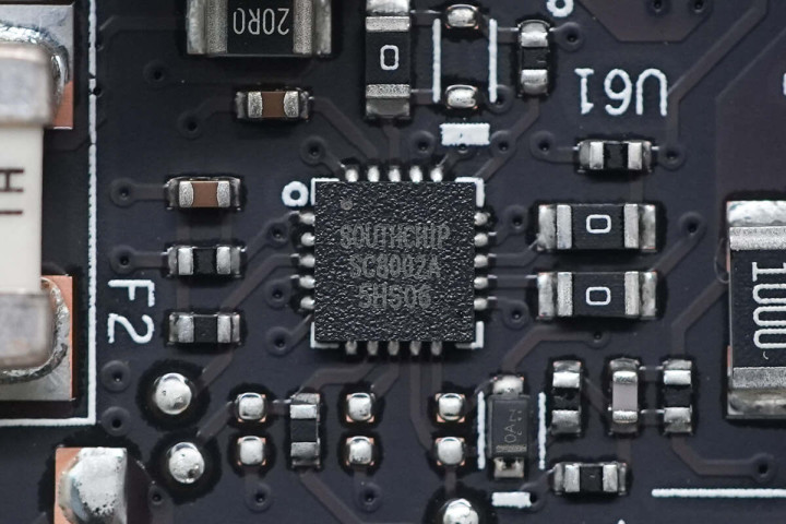 跳线右侧可见一颗南芯科技PD控制器SC2002,支持PD 3.0、BC1.2、DCP、HVDCP、FC、AFC, FCP和其他专用充电协议,采用QFN32封装。