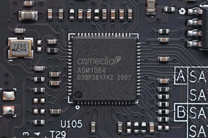 SATA接口左侧还有一颗祥硕SATA控制器ASM1064,支持SATA3,采用QFN64封装。
