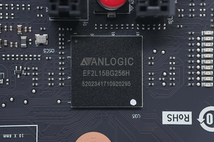 两插槽左侧有一颗Anlogic安路SALELF 2系列FPGA芯片,型号EF2L15BG256H,采用BGA封装,内置Flash。芯片左上侧25MHz晶振,用于为该芯片发出时钟信号。